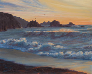 A painting of wind in the waves catches the warm glow of the setting sun in a brisk stroke of orange. Original plein air paintings and studio paintings are available for sale at www.JanetArlineBarker.com
